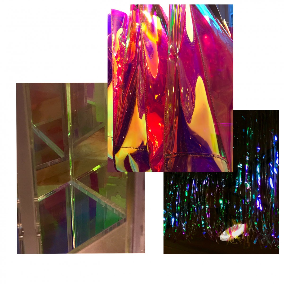 - I looked at my surroundings for fabrics, surfaces and objects that create colour with the effect of light shining through. I realised that the one's that made the best effects where the materials that were semi-transparent with hints of other colours. This was because they managed to project the colour they were including the multi-colours of the light projections.