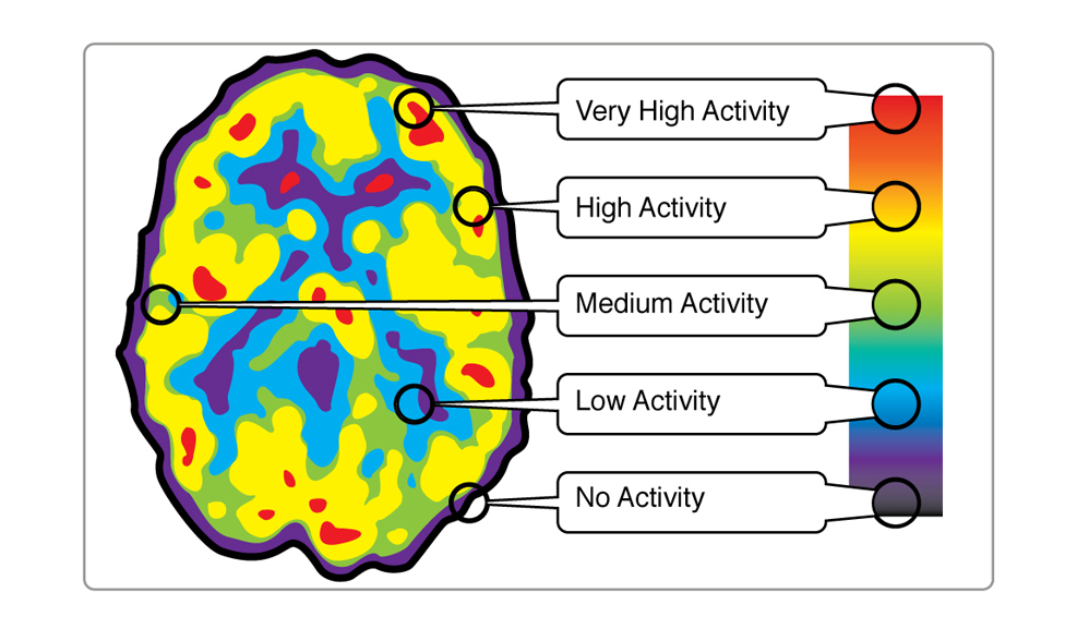 "To create the colorful PET image, a computer displays each measurement as a series of tiny dots. The color of each dot shows the intensity of the energy signal. Red indicates the highest intensity—in other words, the area of greatest brain activity."