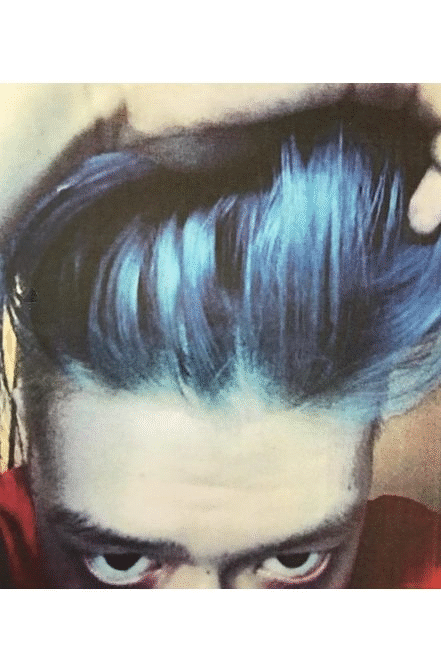 - Dying his hair - Blue (and other colours) - Throughout the years he's changed his hair colour and style in all sorts of colours from pink to green, to blue, I asked why did he do this and he replied that this habit came from the fact that he used to have very short, shaved hair always grouping up because of his strict father and how he always had to have "minimal hair styling' with him playing basketball. Now that he practices his art more than sport he feels free to expresses himself more and feels the freedom from living away from home by dying his hair.