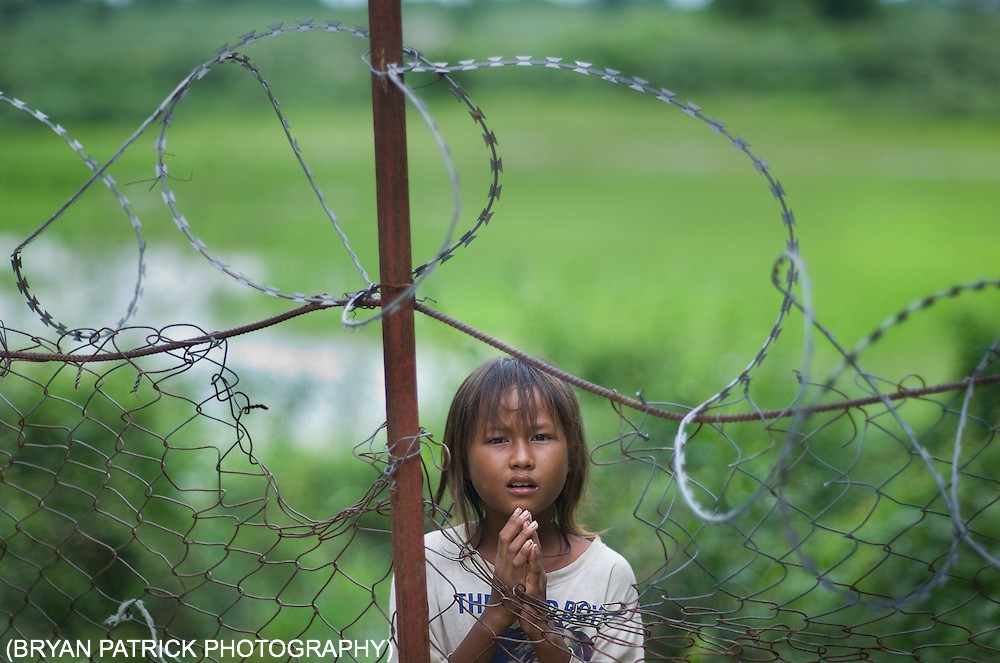 "A little girl begs for money outside the barbed wire fence at the Killing Fields museum in Cambodia."