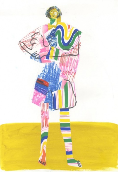 I have chosen to research into Booth's fashion illustrations, as I love his use of mixed media and loose mark marking as a form of portraying what he see's in front of him. His use of colour is brave as he chooses to use dissimilar colours such as a bright yellow, deep green and bubble-gum pink all very close to each other (in the second photo below) which in the end makes for an interesting vibe. I also like the way he repeats colour and pattern (as seen in first photo withe the blue on the leg and skirt) as this makes for a more considered and coherent appearance.