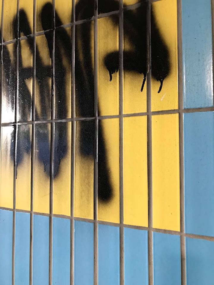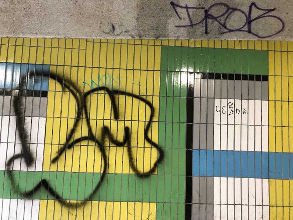 This is a photo I took of some local 'name tag' graffiti. This image is my favourite image from my research for this project because of the layering effect of the public's art on top of the already public art. What I mean by this is that someone, wholeheartedly, from the public has come and spay painted their form of 'art', (which is their name tag) on top of the already existing mosaic on the train station walls. I find this incredibly interesting and inspiring for this weeks project and will help me develop my ideas.
