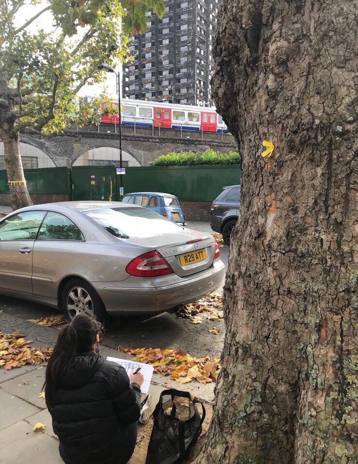 We did observational drawings of the Architecture and took photos. These were helpful as I could compare my drawings of the linear structures I saw in front of me with the broken, crumpled structures of the Grenfell I have drawn over the weekend.