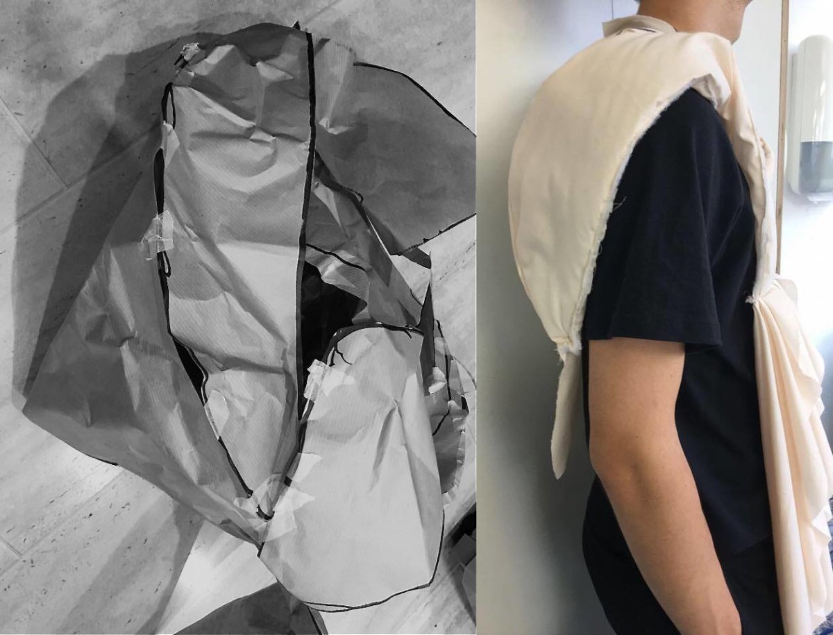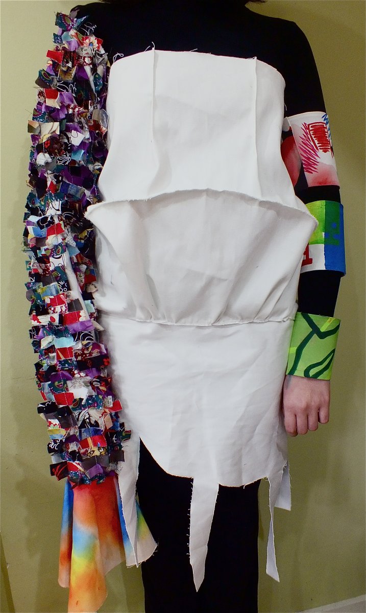 I wanted to incorporate all my my best findings from the past two days into my final garment design. I looked back at my observational drawings and photographs of my findings to inform my last design process. Whilst piecing together my best findings I realised the draping on the back wasn't working in coherence with the shapes I had made for the front. This was because the back was very straight and linear whilst the front was abstract and ruffled. I was struggling to find a solution with fixing the front and the back so I decided to put my garment onto a real person and use pins and some quick hand stitching to manipulate the fabric in order to connect the back with the front in a more well executed way. Although I managed to connect the front and back in a successful way I found that I did loose the linear shape of back that I had originally draped on the mannequin in class.