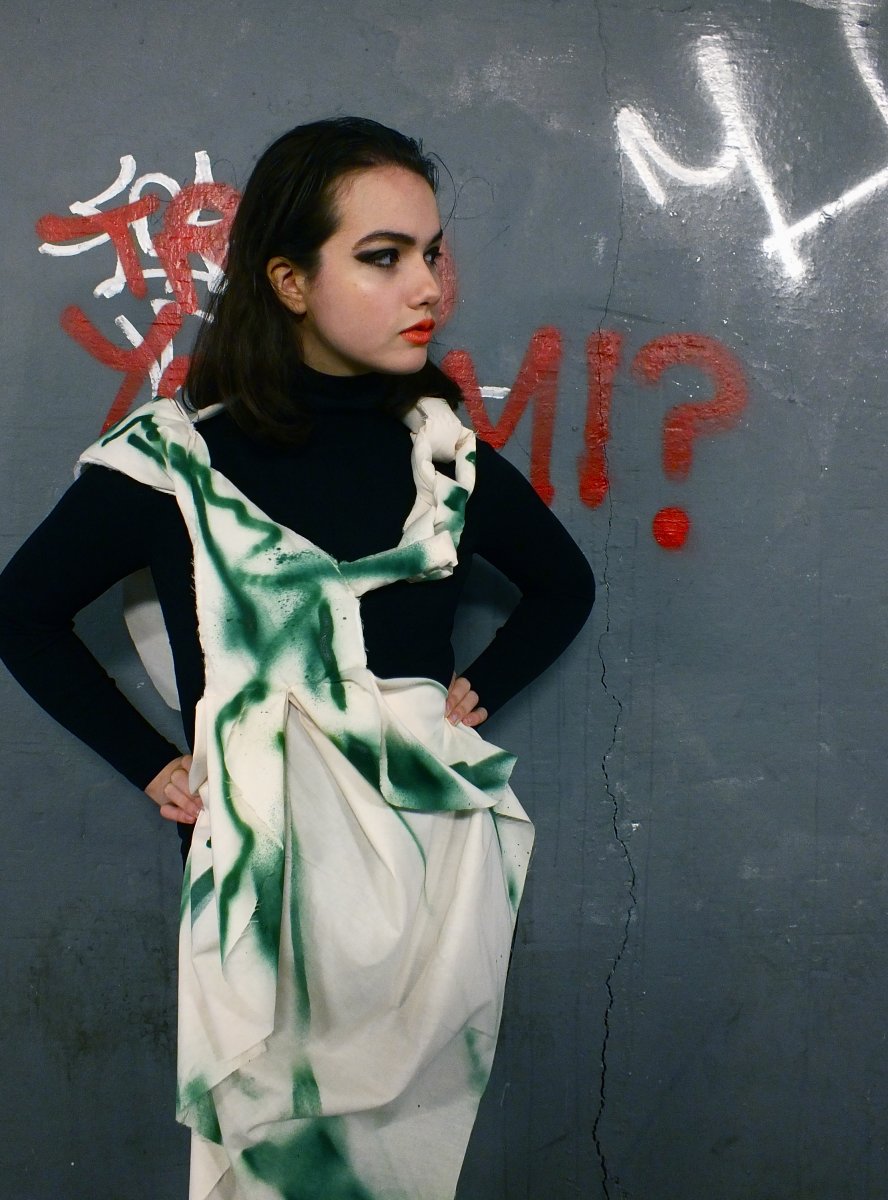 'This whole performance has represented by the process of knitting. Knitting consists of layering and we have layered Nichole (our model) with aspects that make us happy. But like the knitted structure and the mesh material these aspects can easily be unraveled and contain holes. We need to keep mending, knitting and layering things, in order to keep our happiness.'