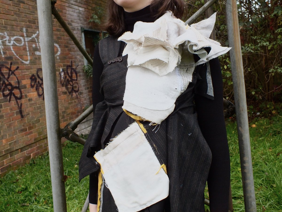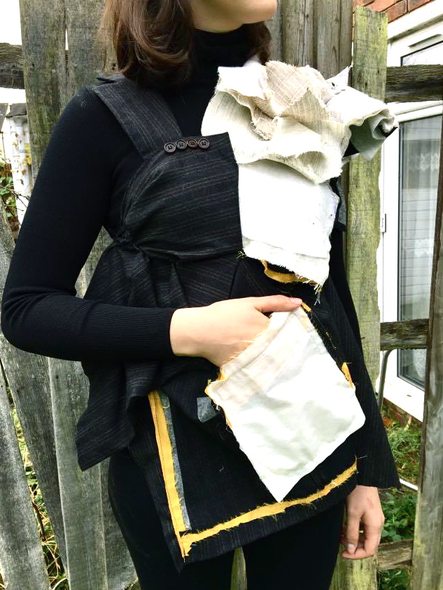 What I've found most successful in my final garment is the fact that you can still tell my garment was originally a mens tailored blazer with the sleeve details and buttons on show in the front. I like how these an almost functioning pocket at the front, which I have reversed so that the outside of the pock is now on show in the front of the agreement. This shows my re-imagination of the jacket, which is what I have been discovering and developing during the course of the week.